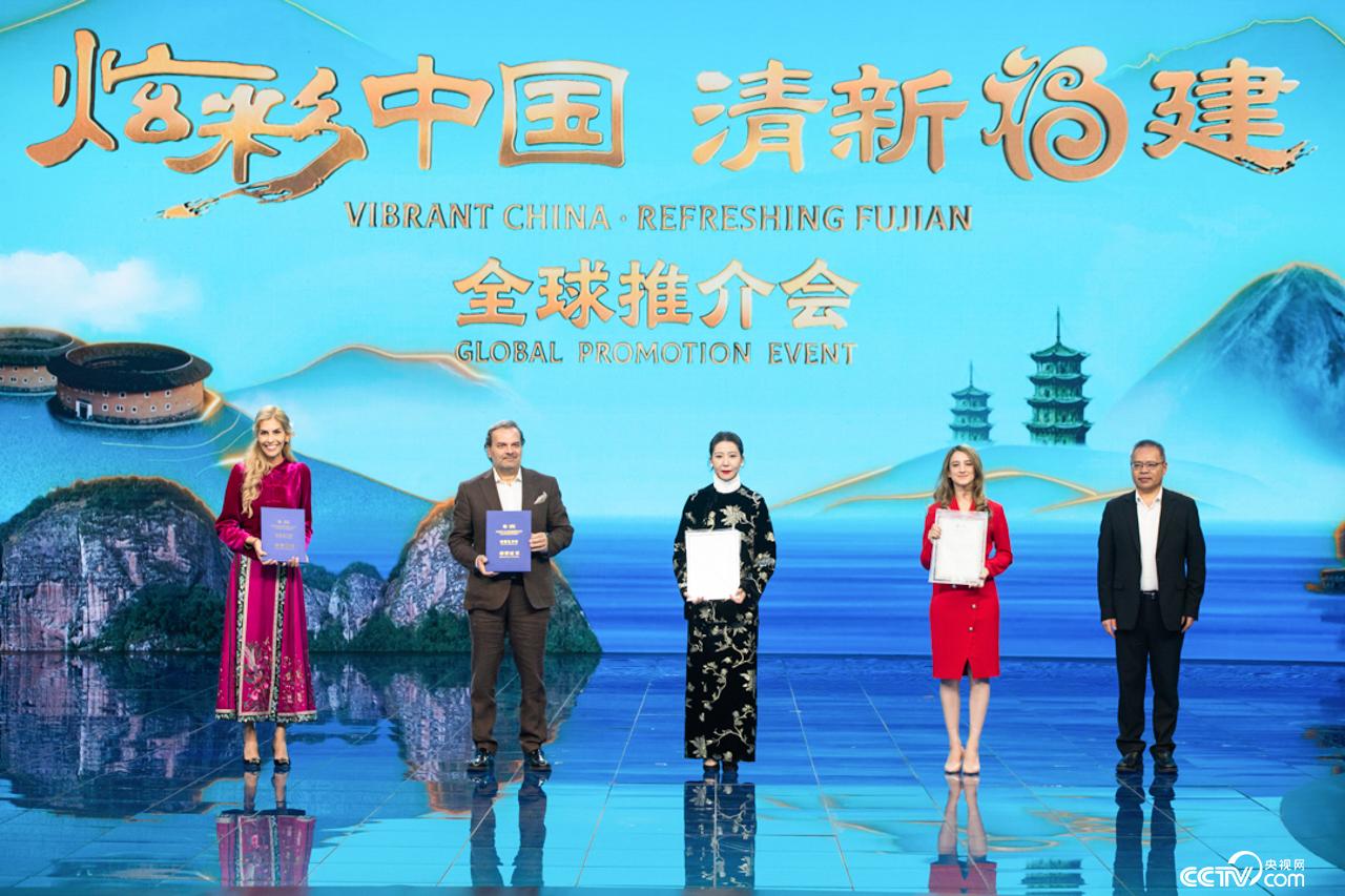 现场为全球知名艺术家代表——美国歌剧演唱家卡拉·卡纳莱斯,意大利视觉艺术家、导演恩里克·卡斯蒂列尼,“清新福建”全球文旅推介官代表——环球旅行自媒体博主杨宝迪和自媒体博主于中美颁发证书,共同开启一场“清新福建”的国际文旅交流新航程。